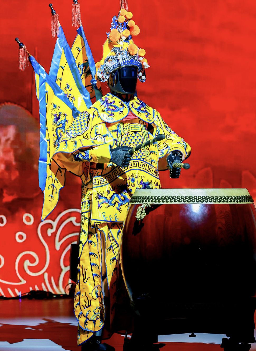 舞台两侧,两尊身披传统戏曲重甲服装的身影静默伫立。那是智元远征A2。但此刻,它不再是那个刚在11月创下“单次充电行走106公里”吉尼斯世界纪录的“苦行僧” 。它换上了一身繁复绚丽的中国京剧武生行头,背插四面“靠旗”威风凛凛,宛如《挑滑车》里的高宠重生。